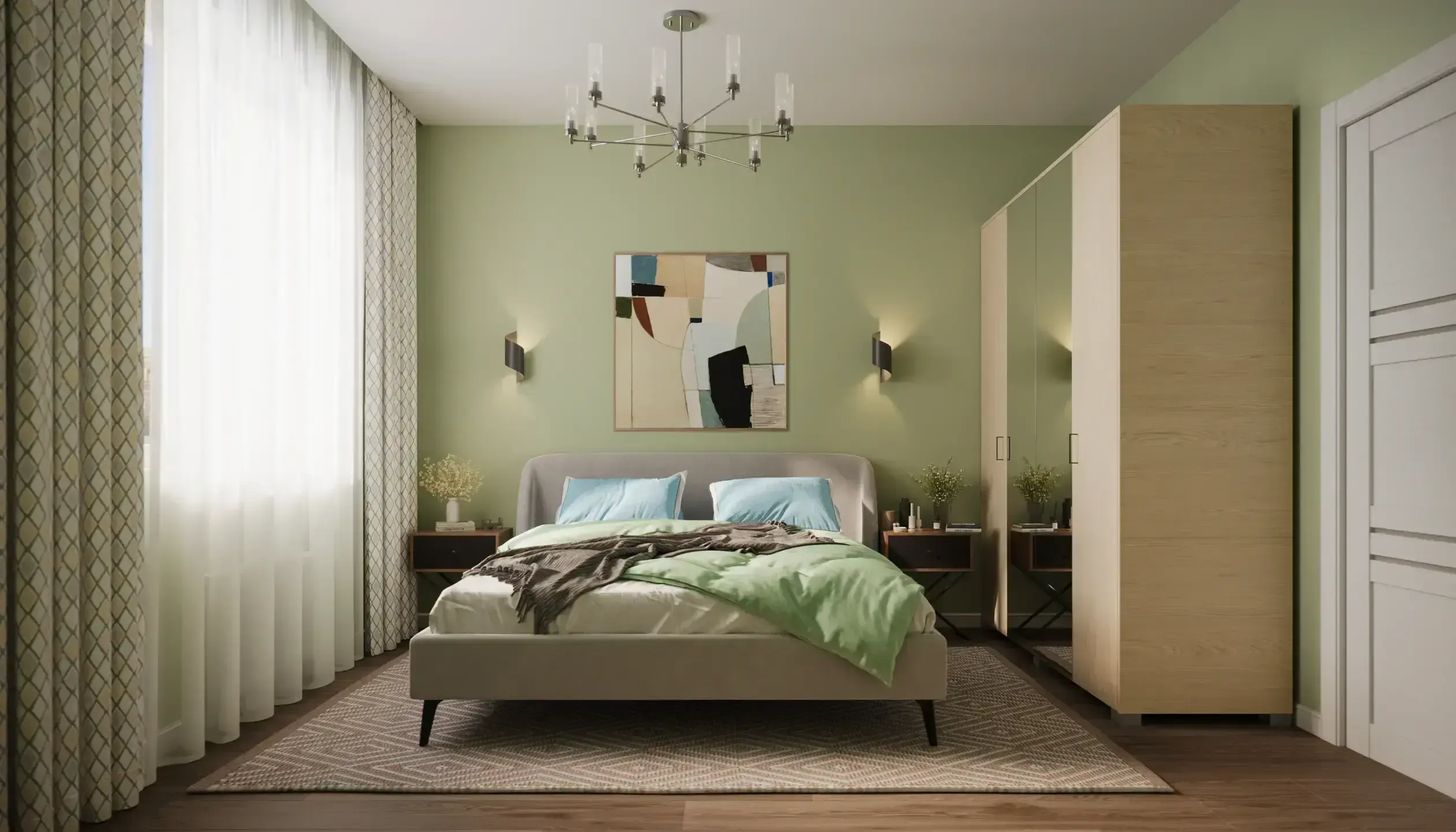 В проекте квартир использован приём совмещения кухни с гостиной. С помощью разных цветовых решений общее пространство поделено на зону приготовления пищи и зону отдыха, использование однородных материалов, родственных цветовых оттенков и мебели в едином стиле позволило сохранить целостность восприятия интерьера. Для спальни выбрали палитру природных оттенков, что помогло сформировать мягкую атмосферу уединения и спокойствия. Интерьер детской комнаты обеспечивает личное пространство для занятий, хранения вещей, сна и досуга двоих детей.