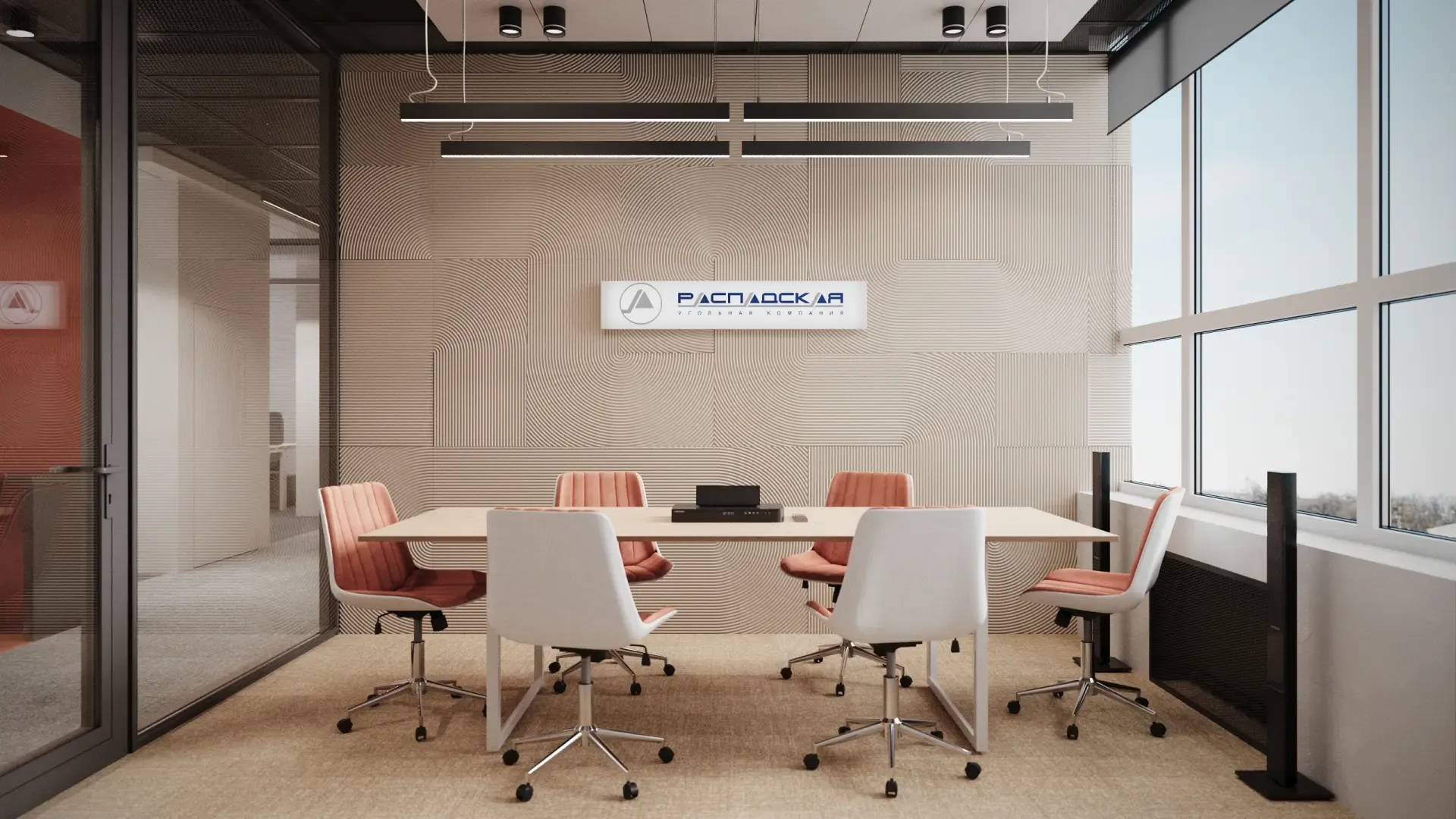 Для рабочей зоны создан лаконичный интерьер в сочетании серых и белых матовых поверхностей со светлым деревом. Такой дизайн не отвлекает от работы, не утомляет и уравновешивает избыточную инсоляцию. Для потолка дизайнерами «Миторры» был разработан нестандартный дизайн потолочных подвесных панелей, они выполнены по индивидуальному заказу во взаимодействии с подрядчиком, изготовившим эксклюзивные элементы обшивки. Дополнительные решения по звукопоглощению скрыли за потолочными панелями. Также была предусмотрена необходимая в офисе с открытой планировкой звукоизолирующая кабина для разговоров по телефону. Над рабочими местами разместили светильники на низком подвесе, направляющие мягкий комфортный для глаз свет непосредственно на столы.