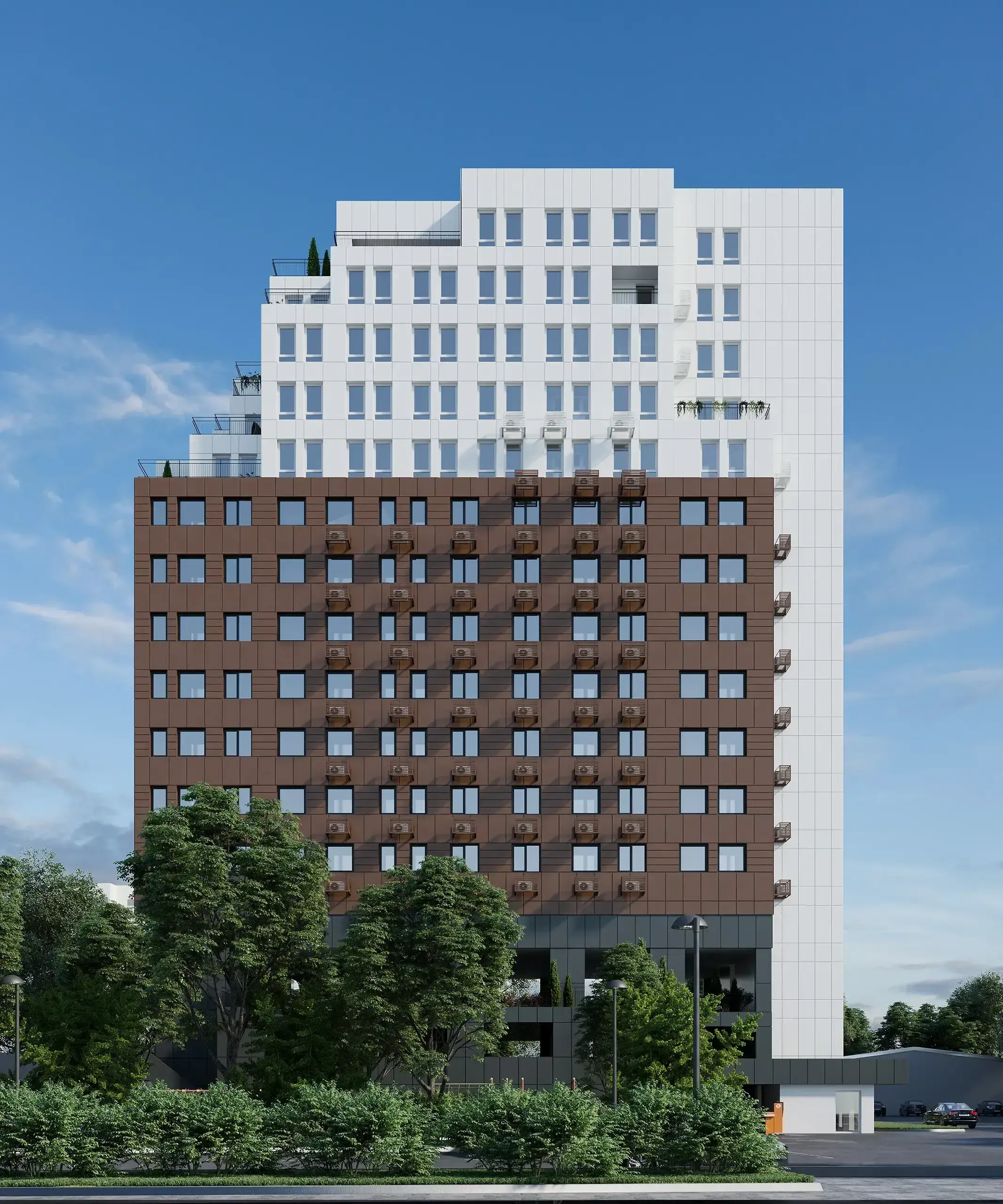 Одно из таких решений — открытый наземный паркинг, размещенный на первых двух этажах комплекса. Это позволяет оптимизировать расходы на обустройство инженерных сетей и вентиляции, по сравнению с инфраструктурой подземных паркингов.